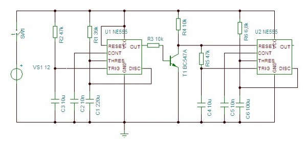 | omschrijving: Double One-Shot timer with constant trigger, schematic |