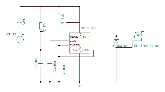 | omschrijving: 555 timer in One-shot modus waarbij eenmalige trigger uit een constante 12V komt. |