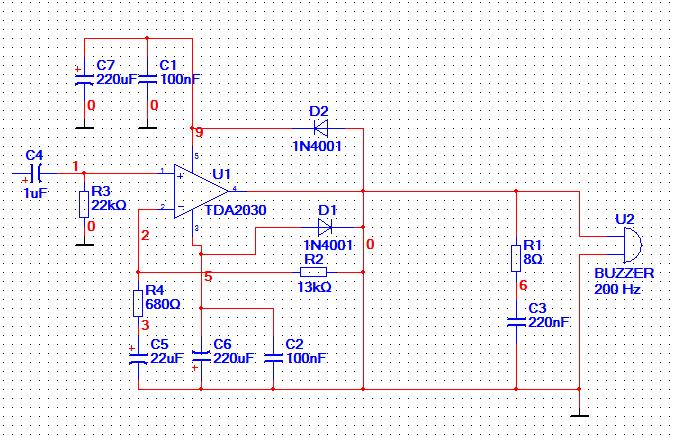 | omschrijving: schema 10 W versterker op multisim |