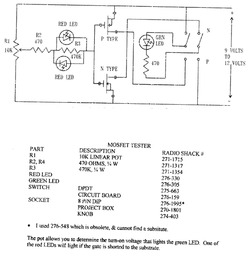 | omschrijving: simpele mosfet tester, voor N-kanaals en P-kanaals |