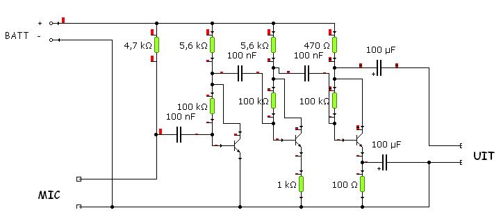 | omschrijving: Schakeling klein versterkertje voor elektret microfoon. |