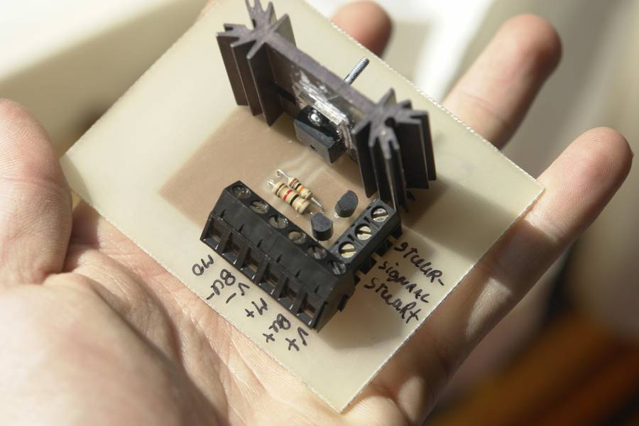 | omschrijving: Printje wat de motorstroom gaat schakelen: FET IRF1310N, diode BYT87 en 2 torretjes als stuurtrapje. |