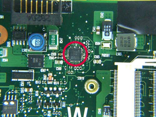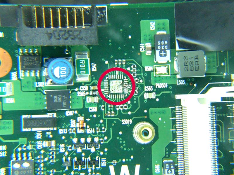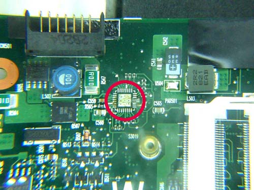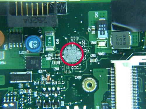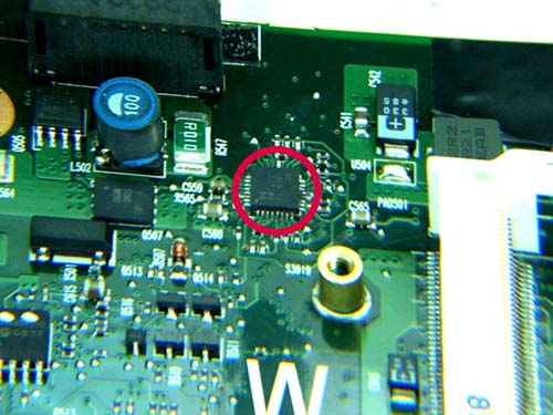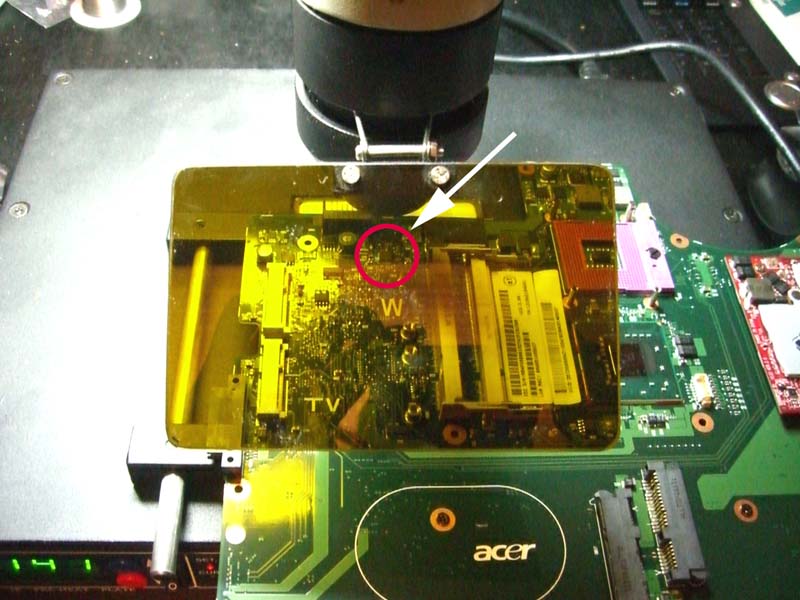 | omschrijving: Schoonmaken PCB met flux, waar voorheen defect IC zat (grote foto) |