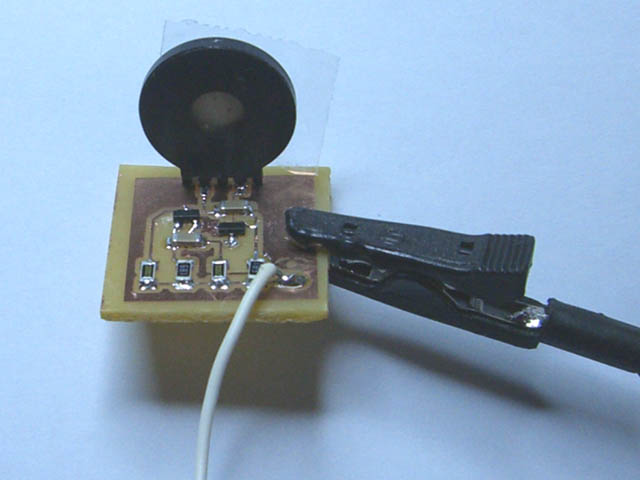 | omschrijving: Afbeelding printje van werkende buzzer op basis van een passief piezo-element. |