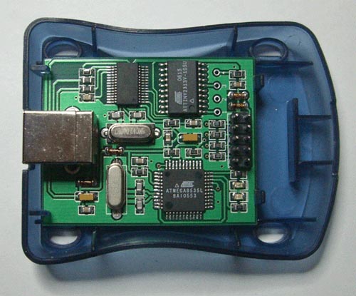 | omschrijving: Foto binnenwerk van de USB STK500 programmer, gekocht via SureElectronics. OPM : Geen mkII-programmer dus. |