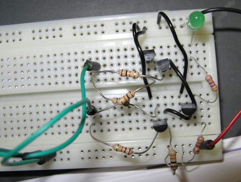| omschrijving: Foto van Xor uit transistoren op breadbord |