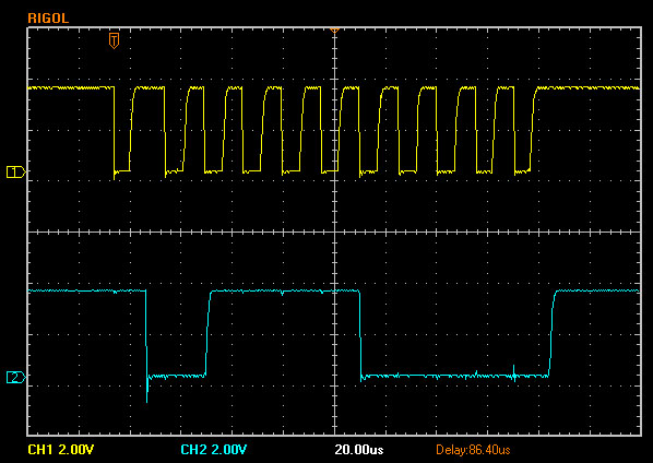 | omschrijving: Scope I2C 400KHz "CLS" + tekst naar OLED (per seconde een update) |